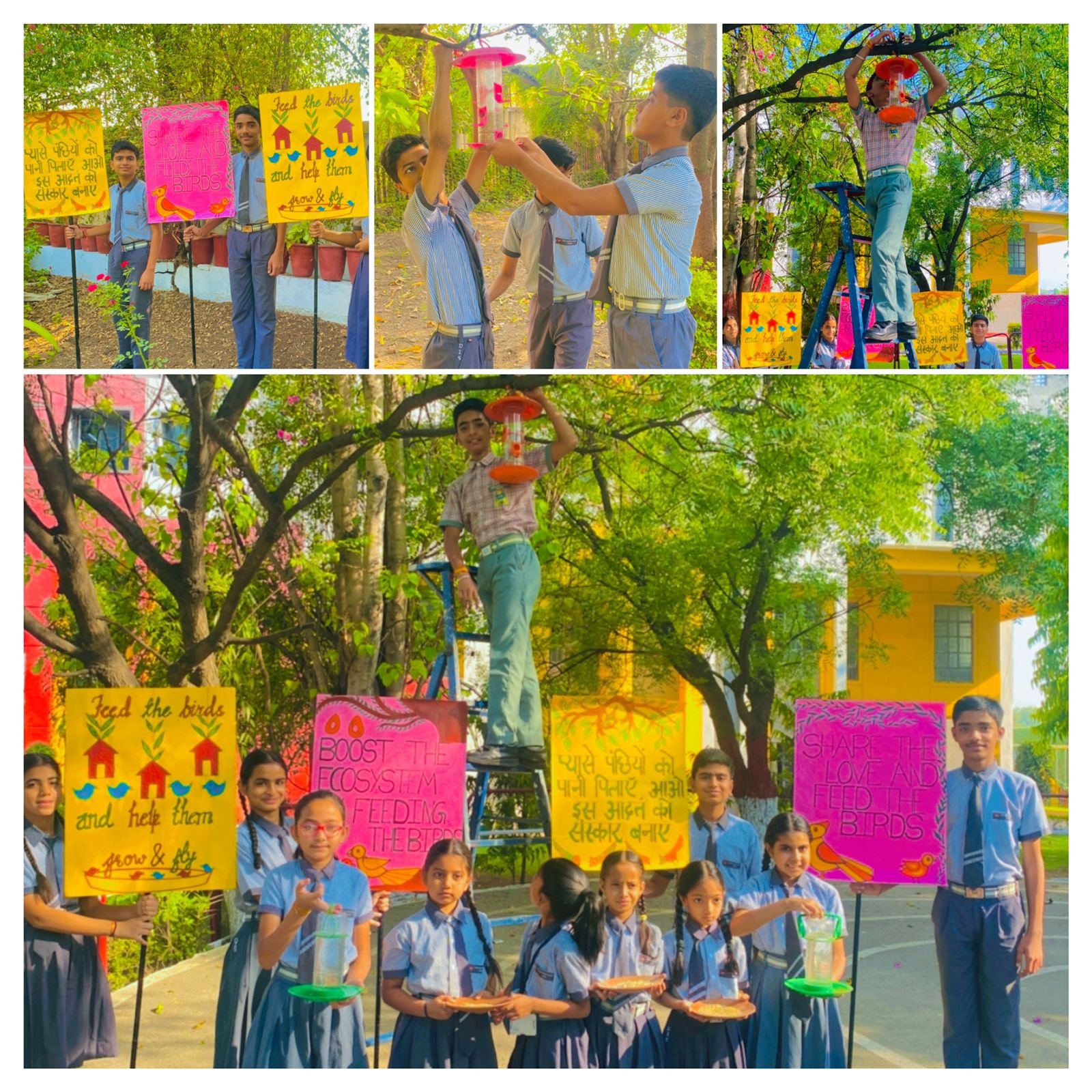 Welcoming birds into our yard , feeding them , putting pots of cool water can be a great step towards saving wildlife. For invoking empathy towards birds , Feeding the birds campaign was started in our school campus. All the teachers and Students participated in this campaign by feeding the birds , keeping pots of water and pledged to keep the same during the whole year. Watching these flock of birds was an eye soothing moment and filled everyone’s heart with joy. Students displayed the message of Protecting our feathered friends! Save Birds