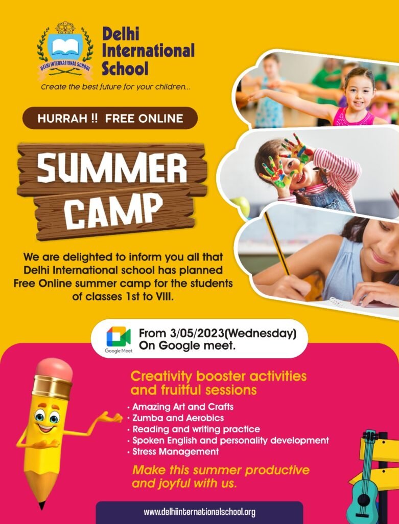We are delighted to inform you all that Delhi International School has planned free online summer camp for the students of classes I to VIII which will be included Dance, Art & Craft , Spoken English , Stress Management ,Personality Development.